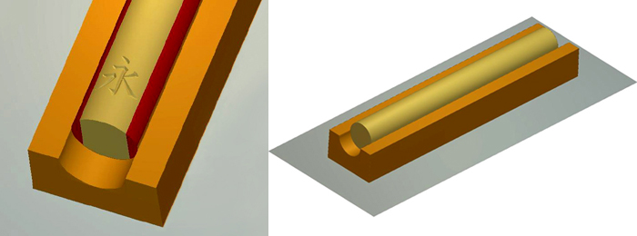 | ★円筒状商材(丸棒)の加工 ・丸棒の径に合わせて治具を制作し、丸棒を設置して加工します。 ・最大文字サイズは、上図の赤い部分以外、丸棒の直径の約75%です。 (縦書きの場合は文字の横幅、横書きの場合は文字の縦幅) ・丸棒を回転させて治具に設置することで、最大サイズまでの文字を外周に並べて彫ることは可能です。 ※板状商材への加工との違い ・円筒状商材に文字を彫刻する場合、かまぼこ状の半立体に文字が刻まれている立体として、3D彫刻を することになります。そのため、3Dグラフィックの図面を作成して、細かく3D彫刻をするので、 板状商材への加工よりお時間が掛かります。(料金がアップします。) |