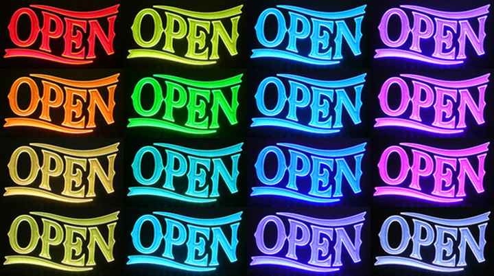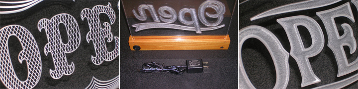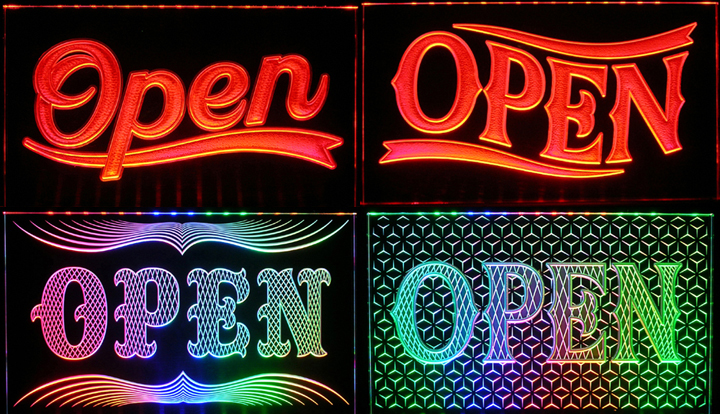 | 光り具合のサンプルです。上2つが立体彫り、LEDの光色は赤、オレンジ、赤、オレンジ、赤。下左はV溝彫り、LEDの光色はオレンジ、赤、青、緑、オレンジ。下右はV溝彫り、LEDの光色は緑、青、赤、オレンジ、緑。 ★彫刻された文字『OPEN』は全て当店オリジナルデザインの字体で市販のフォントではありません。 |