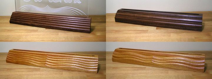 | ベーシックセットの木彫りスタンドサンプル。木材はウォールナット(上2つ)、ケヤキ(下2つ) ★木材の種類やデザインはお好みでお作り出来ます。 |