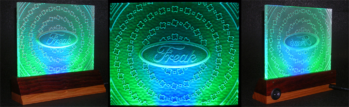 | こちらは自分用のオリジナル仕様、横幅が18cm、V溝彫りと全面立体彫りの組み合わせ、LEDの光色は緑、青、緑、スタンドはブビンガとケヤキのラミネート(2層)仕様。 |